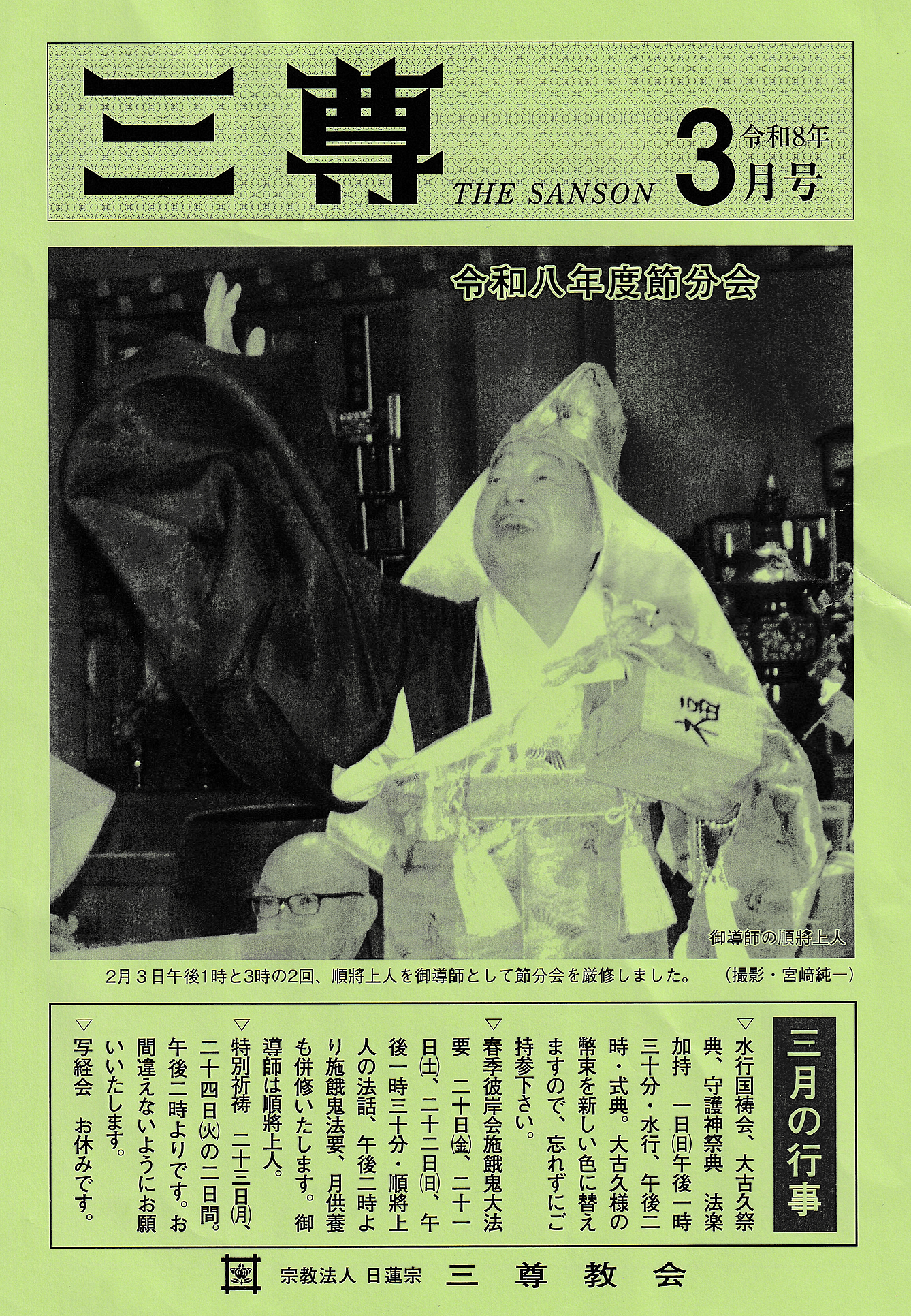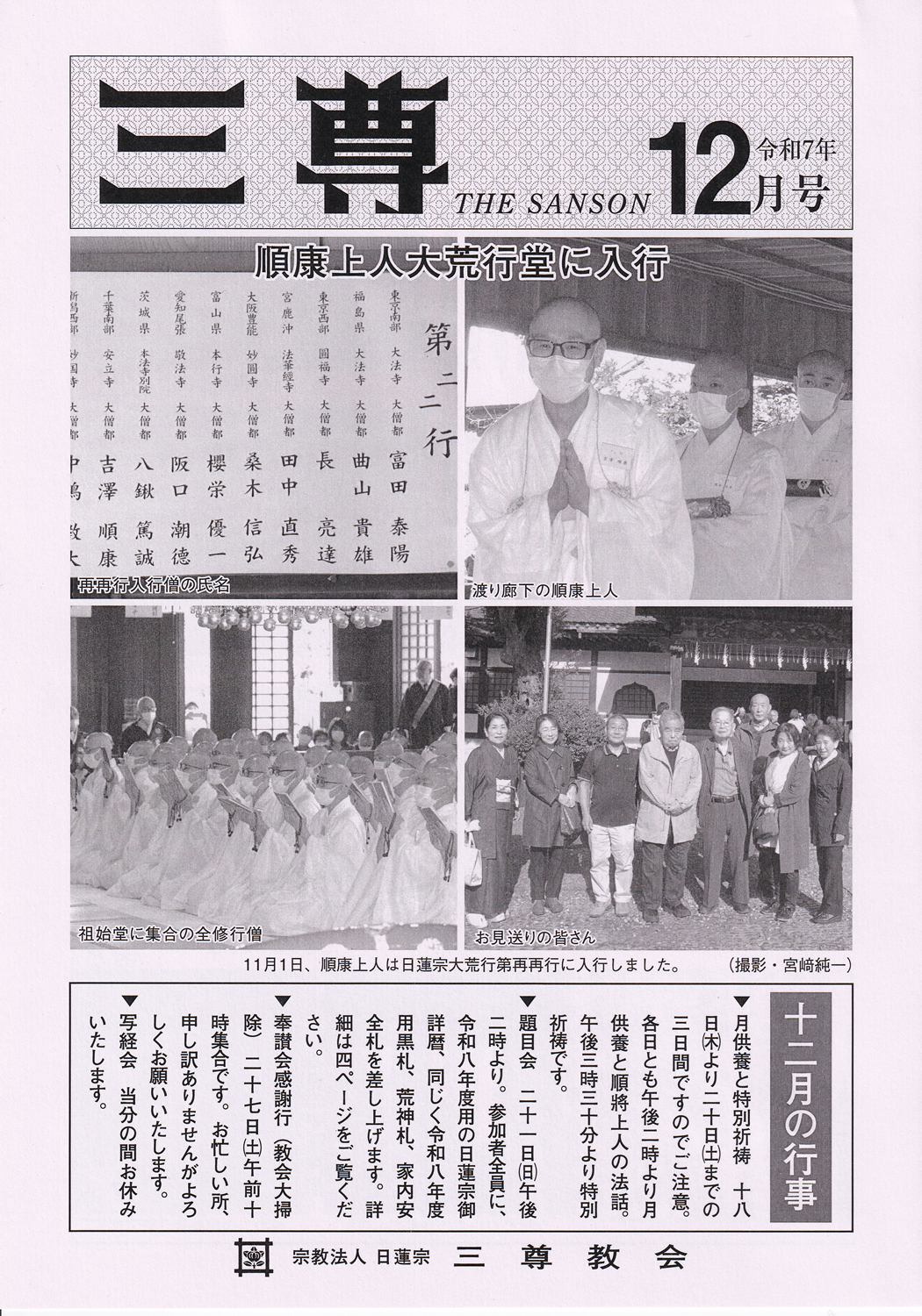 会誌『三尊』には、三尊教会の毎月の行事の紹介を始め、前月に行われた主な行事が写真入りで詳報されています。 また、毎月吉澤順將上人の法話や、今月の教会スケジュールなどを紹介しています。 ご希望の方は、送り先の住所・氏名を明記し、 110円切手を同封の上、下記までお送り下さい。